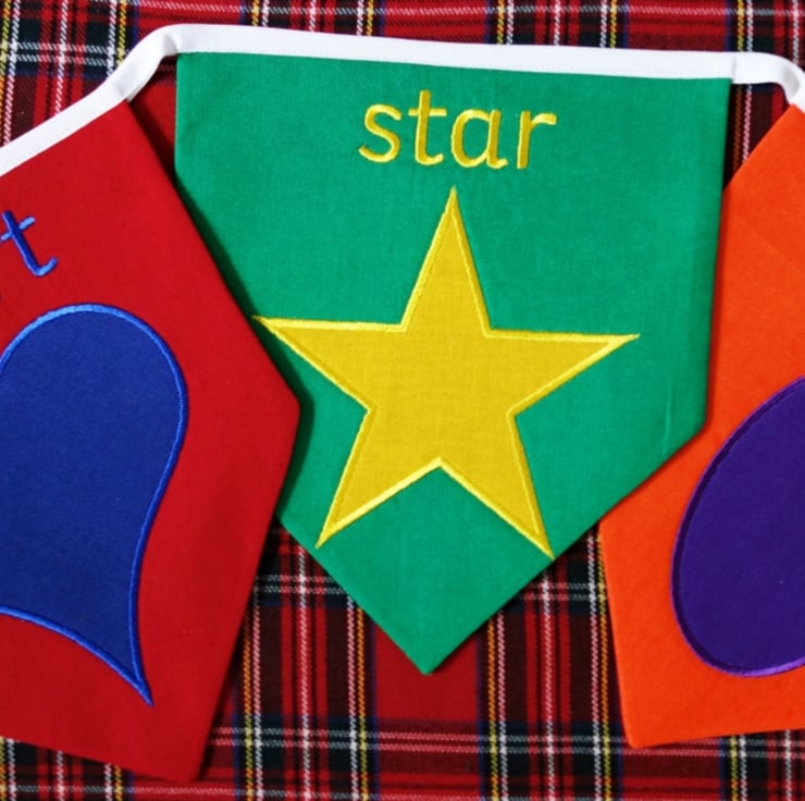 Flags are double sided (plain same colour fabric on reverse), made from rainbow coloured, cotton fabric which has been interfaced, with cotton applique shapes, satin stitched embroidered to secure. Finished with white bias binding.