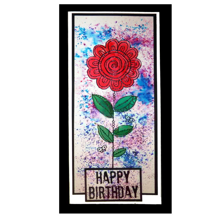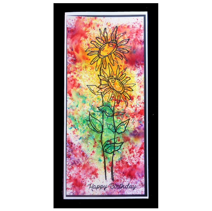 Lovely colourful tall DL side fold card depicting tatty daisies coloured in with Brushos and mounted on black card.