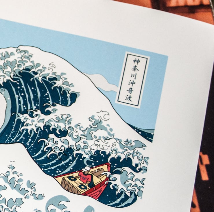 A fine art print of an original illustration based on The Great Wave off Kanagawa Japanese woodblock print by ukiyo-e artist Katsushika Hokusai.