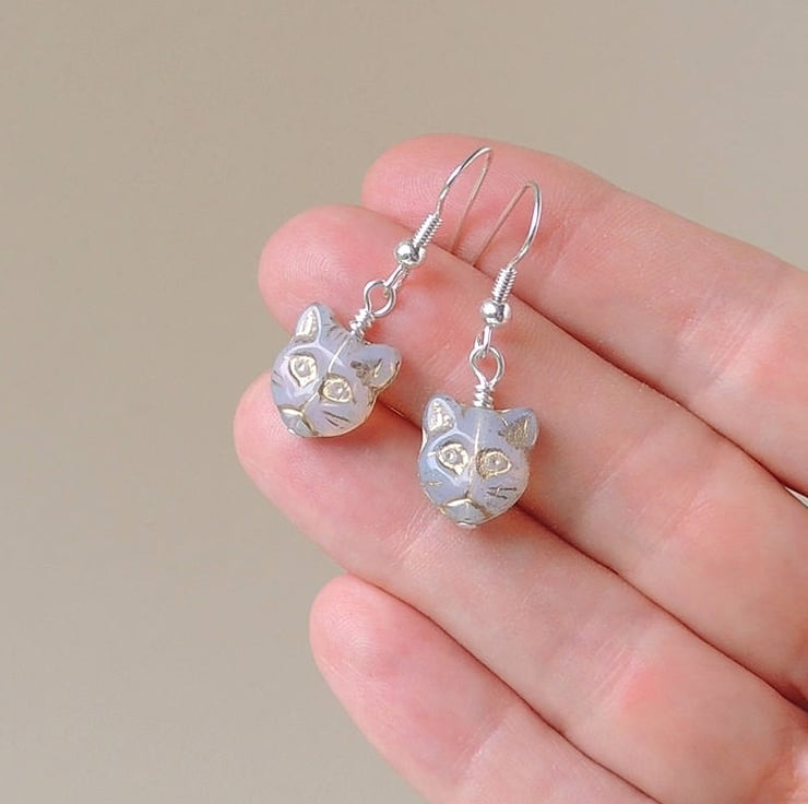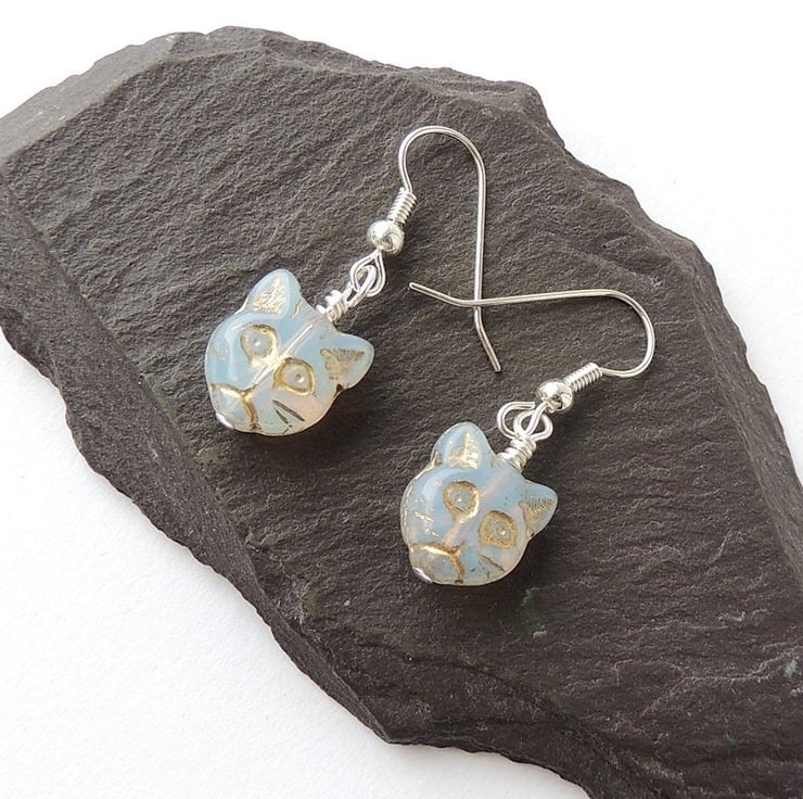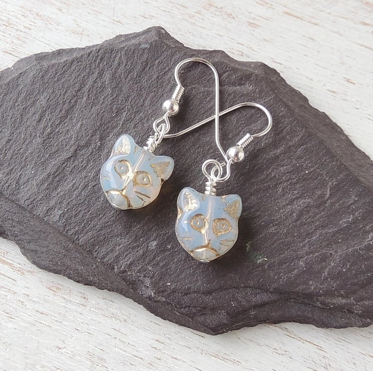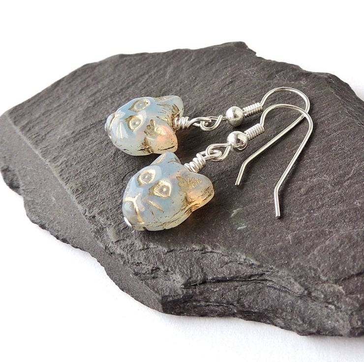 These cat earrings have milky white or pale grey Czech glass cat face beads on silver plated ear wires.