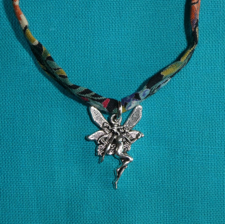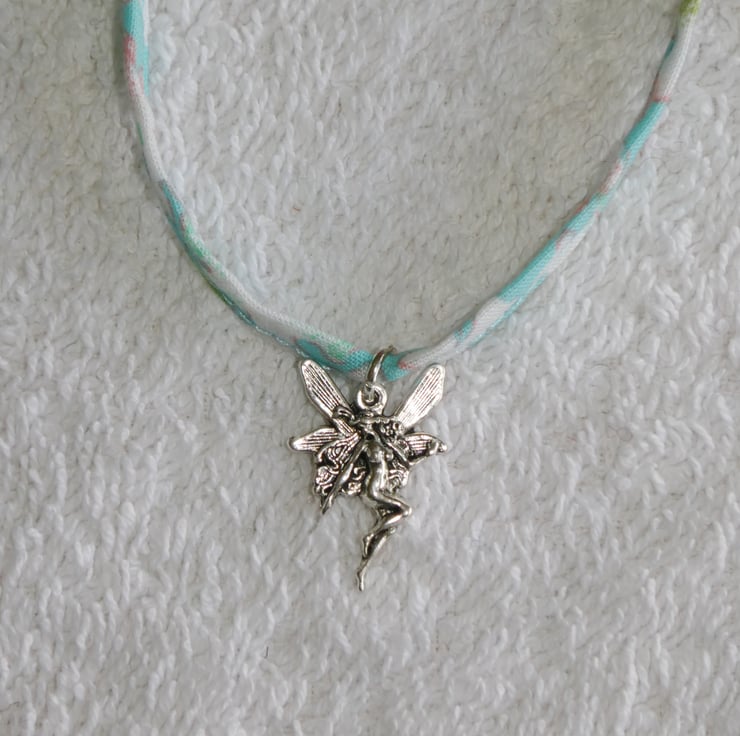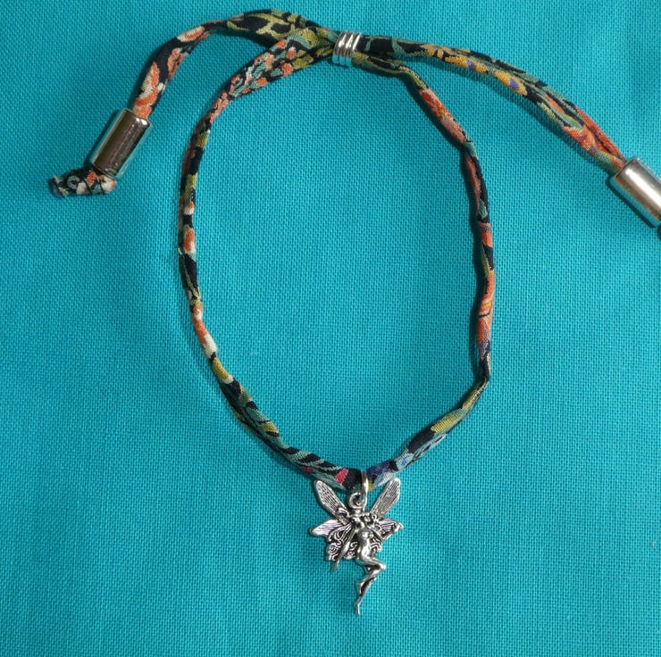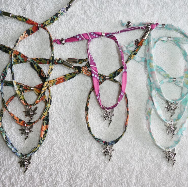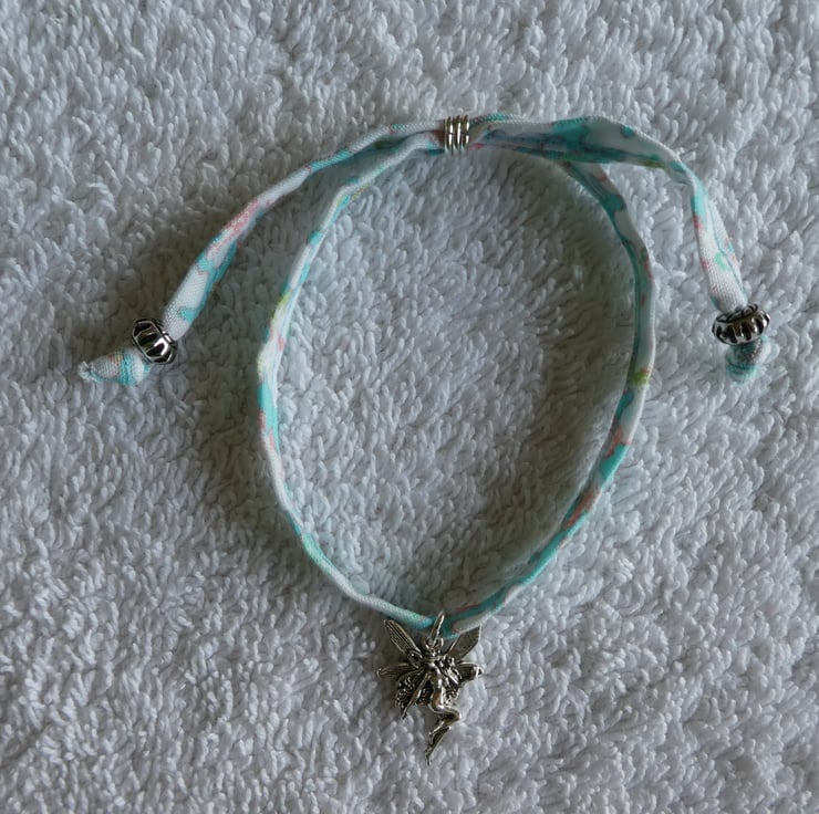 These wonderful fabric bracelets are made from 100% cotton fabric. The material has been stitched into a narrow strip, and then the fairy charm and beads are added.