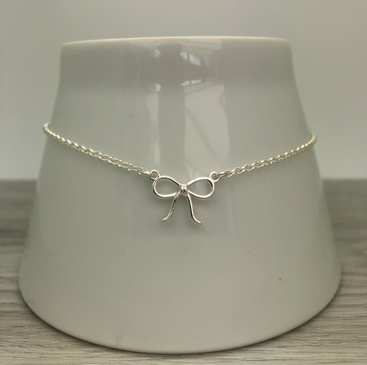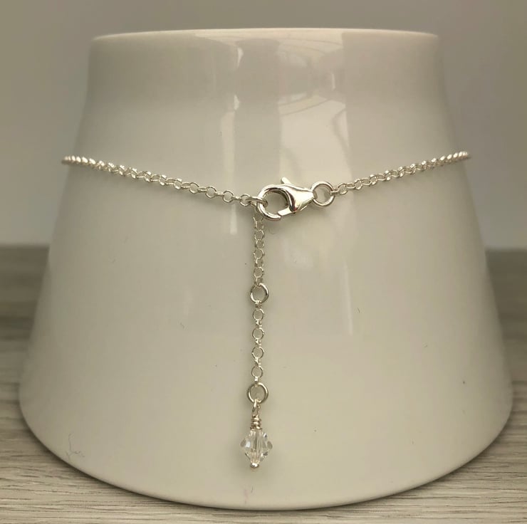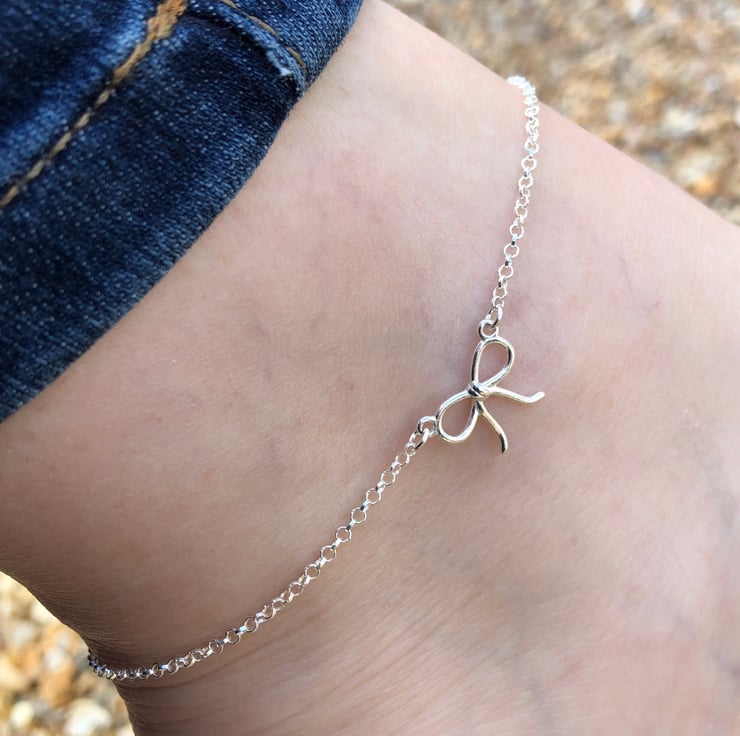 Made using a 14mm sterling silver tied ribbon charm and sterling silver belcher chain. Your anklet will measure 10 inches and can also be fastened at 10.5 and 11 inches. The extension chain has been finished with a Swarovski Crystal.