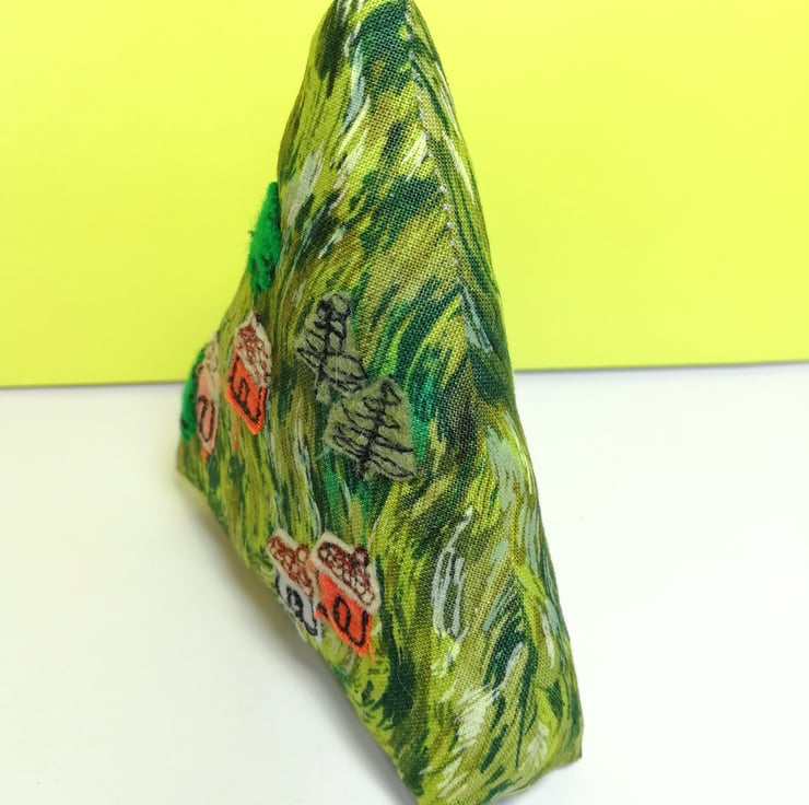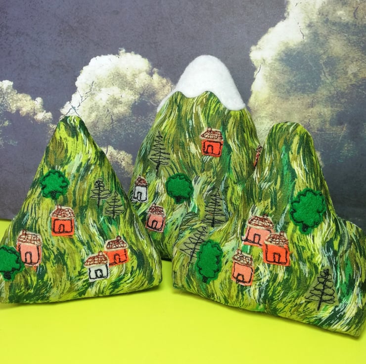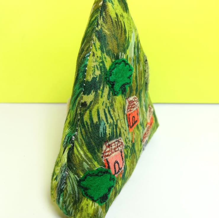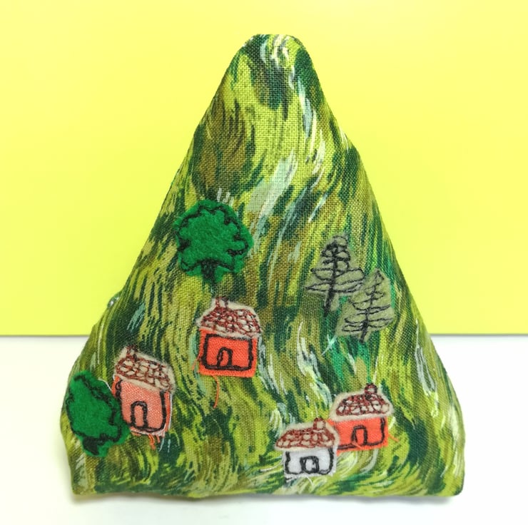 The trees and cottages are machine embroidered with cotton and felt and the hill measures roughly 10cm high and 9cm wide at the base.