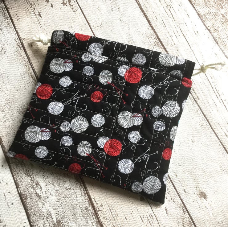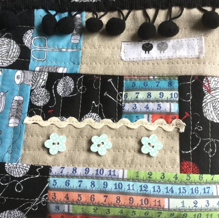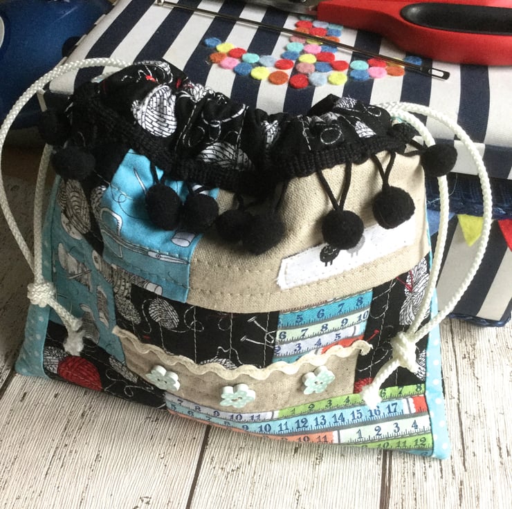 This cute little drawstring bag has been created from scraps of fabric quilted onto a backing. Mainly crafting themed fabrics have been used in shades of black, white, red and blue with pops of colour in salmon pink and green. Black pom pom trim, novelty buttons, the selvedge and rick rack have been used to embellish the piece and white nylon cord has been chosen for the draw string.