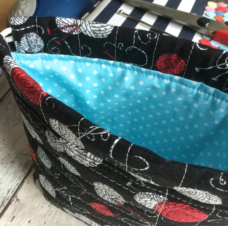 The back of the bag is made of the knitting themed fabric and has been quilted and the cotton lining in blue has a classic white dot design.