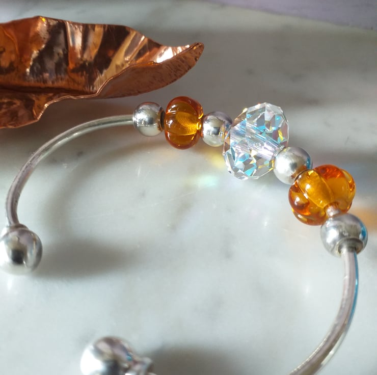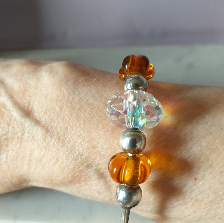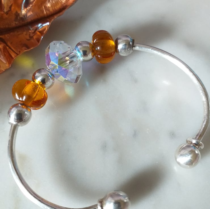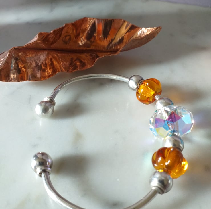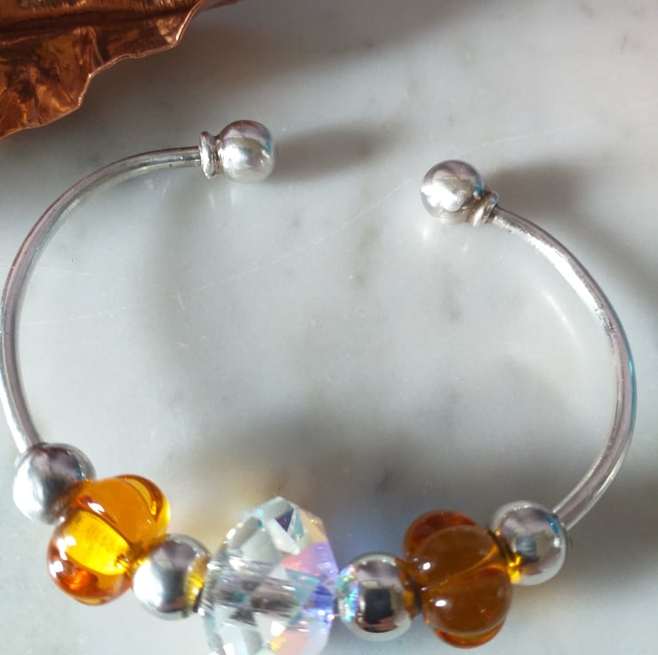 THIS IS A LOVELY BANGLE WITH TWO LAMPWORK AMBER COLOUR EGYPTIAN STYLE BEADS.