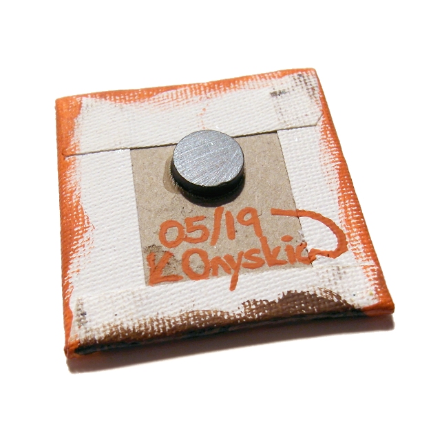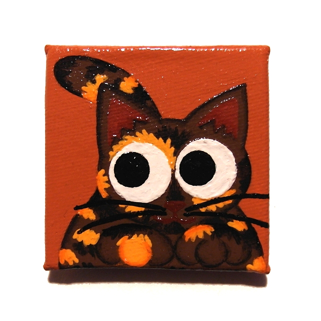 This original cartoon cat artwork is painted in acrylics on a 5cm x 5cm (2" x 2") canvas board, and has been coated with a layer of clear varnish to make it more durable. A 12mm magnet is attached to the back so this little piece of art can stick on a fridge or other magnetic surface.