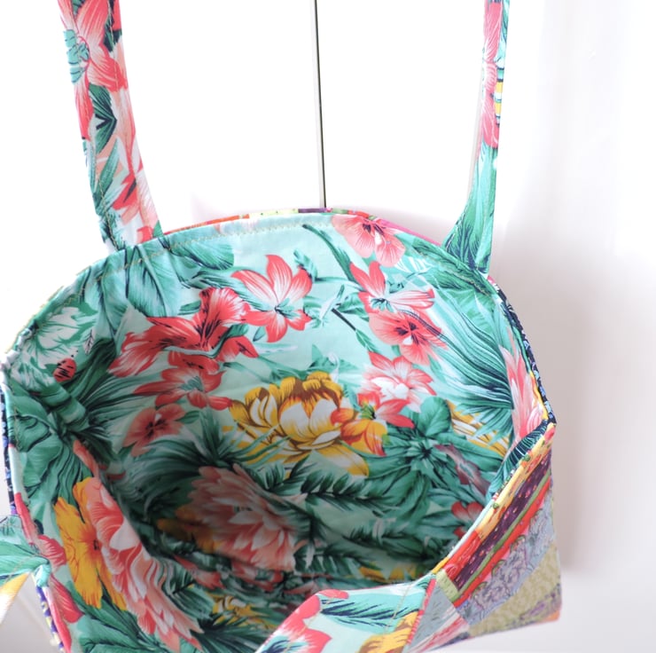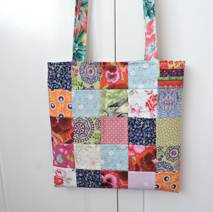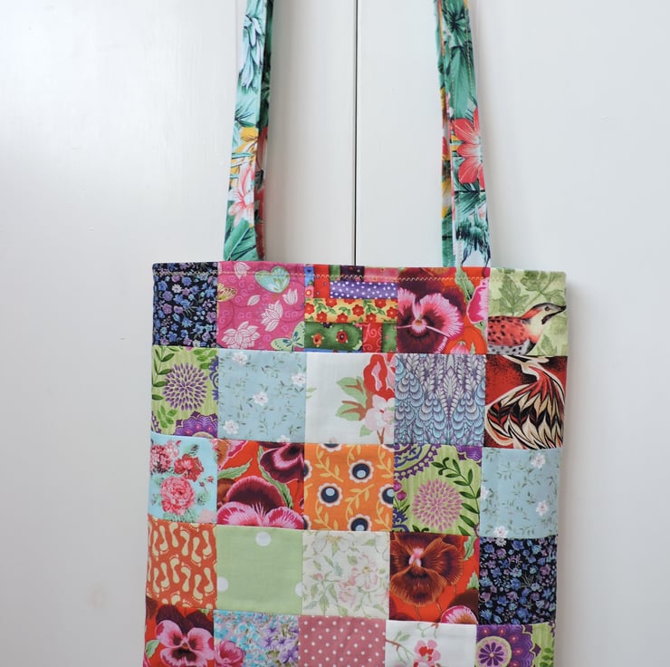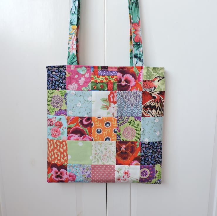 I've made this colourful patchwork tote bag, shopping bag, book bag, craft bag with an assortment of colourful floral and patterned cotton square. It has two handles with are long enough to go over your shoulder and is fully lined in a green, pink and yellow floral cotton fabric.