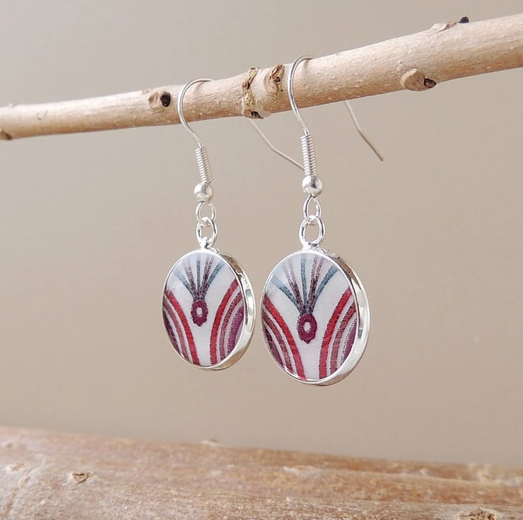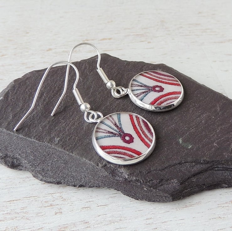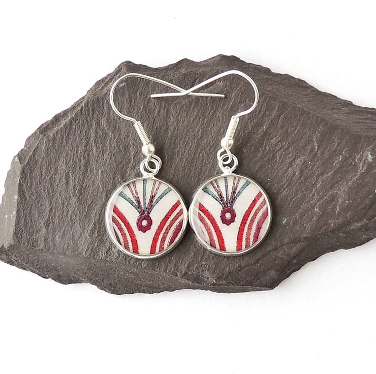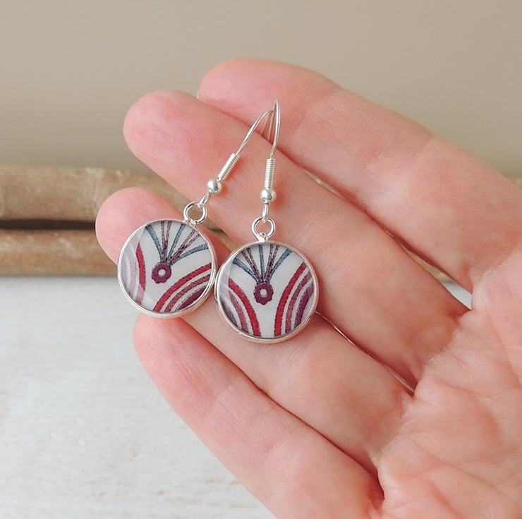 These purple and red earrings have an abstract pattern fabric captured under resin on silver plated fish hook ear wires.