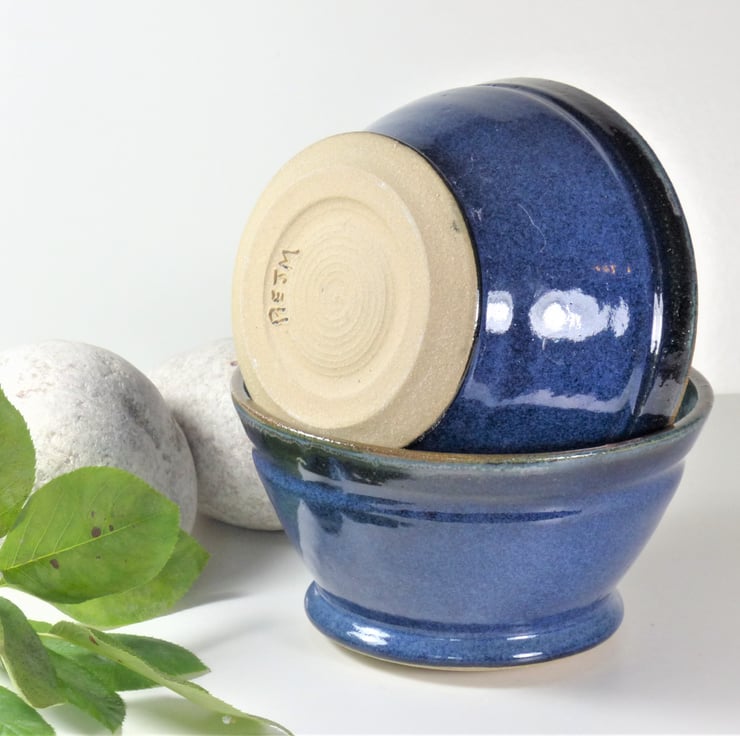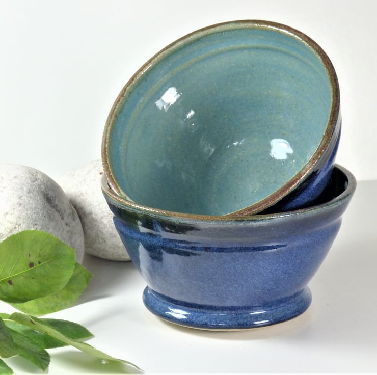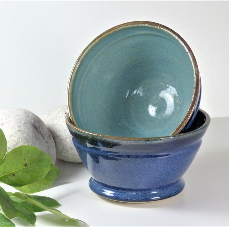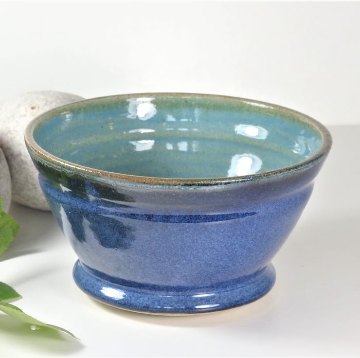 The colours in this bowl include on the inside a rich ovely mediteranian blue, the rim an olive green, and the outside a rich blue.