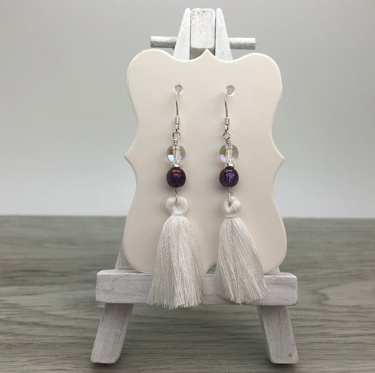 White tassels hang beneath super light catching Czech glass beads, divided by a sterling silver flat bead and attached using sterling silver wire.