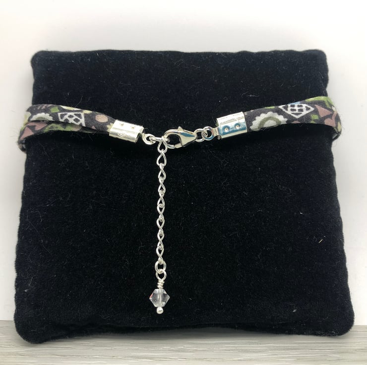 This pretty and lightweight bracelet has been made using two strands of 4mm Pick & Mix D ribbon. The is secured using sterling silver pinch closures and fastens with a sterling silver lobster clasp.