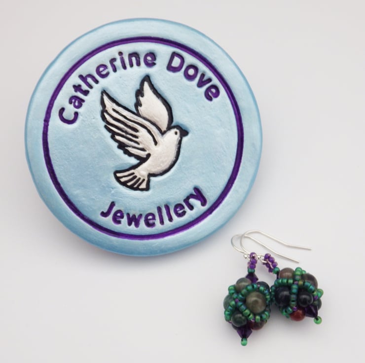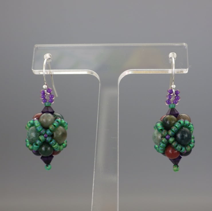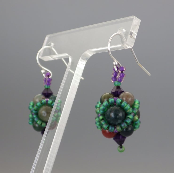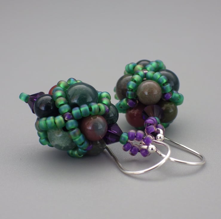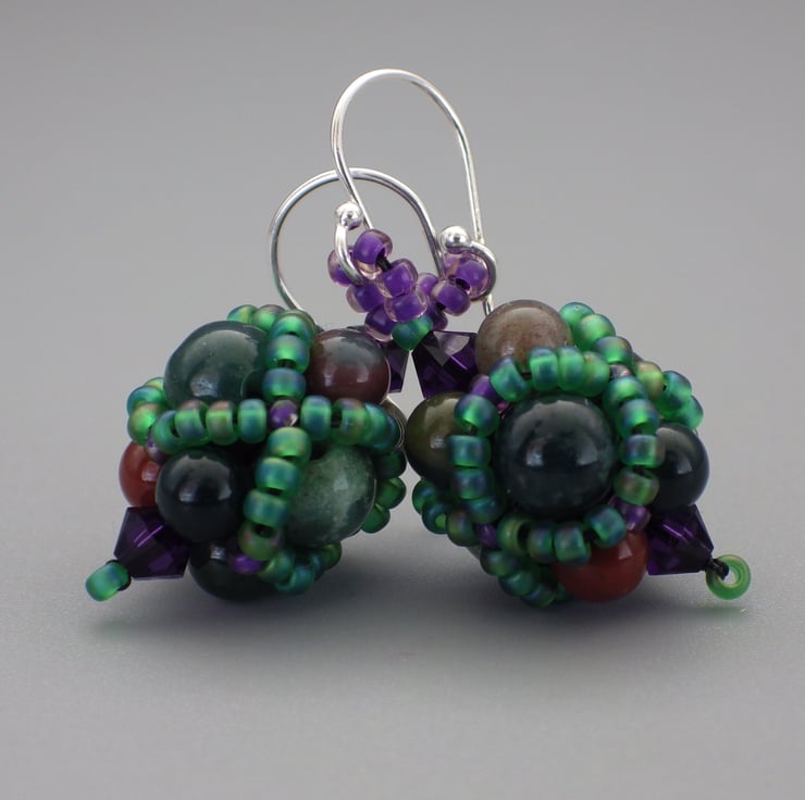 These earrings have been made featuring semiprecious bloodstone beads (green jasper or chalcedony featuring inclusions of red haematite), in two sizes as their centrepiece. I have embellished them using quality Japanese seed beads in a beadwoven netting in a gorgeous matte green and deep purple colours but allowed the semiprecious beads to remain visible. Teamed with fabulous Swarovski crystals in a contrasting purple, they are finished using Sterling Silver findings.