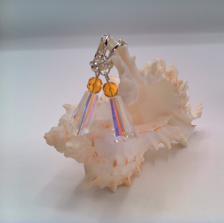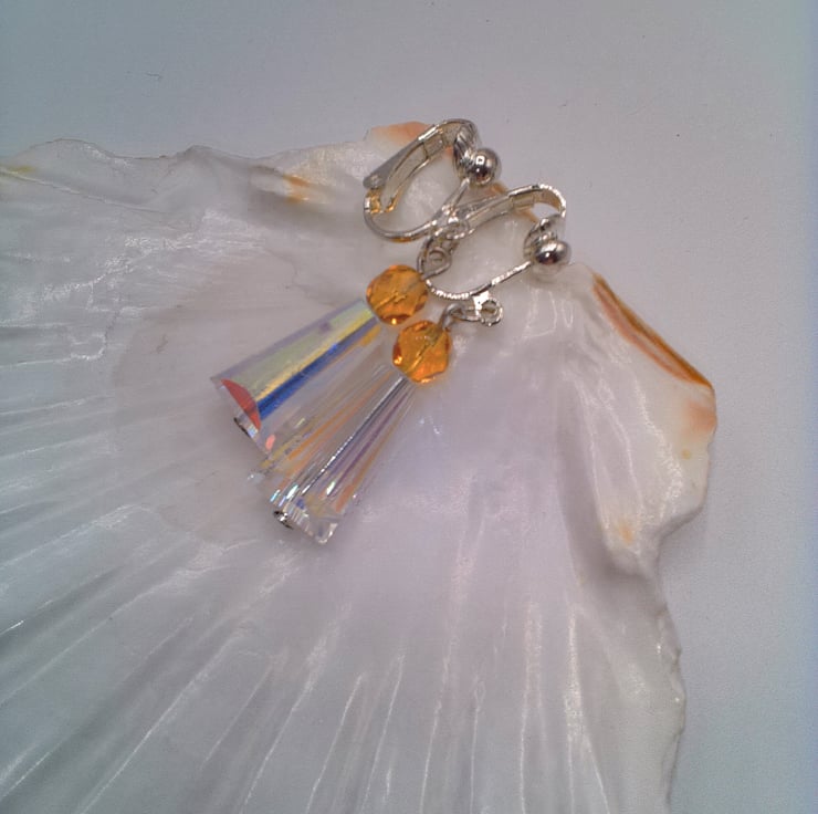 These pretty clip on earrings would go well with any outfit you wear everyday or a casual evening out. They would make the perfect gift for a friend or relative for a birthday or anniversary, or a treat for yourself. They are made for ladies who do not have pierced ears but who enjoy wearing earrings. They are made using 20 mm x 10 mm clear long tapered tube artemis glass beads, with a 6 mm topaz coloured crystal round bead. They are suspended on silver plated clip on ear backs and they have a drop of 3.5 cm from the base of the clip. The earrings will be dispatched wrapped in tissue paper in an organza bag and delivered to you via Royal Mail first class post.