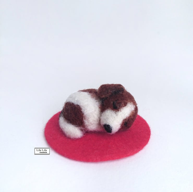 A cute miniature puppy dog needle felted by Lily Lily Handmade. A one of a kind collectable, perfect as a ornament or lucky mascot. The Jack Russell puppy dog, called Barney, is a sleepy little dog who is looking for his forever home. He comes with his own comfortable round red mat.