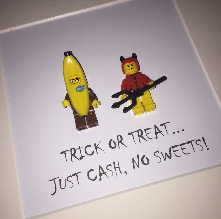 These awesome custom minifigures have been mounted in to a deep box frame. We have teamed them along with the classic quote from the TV series - "Trick or treat! Just cash, no sweets."