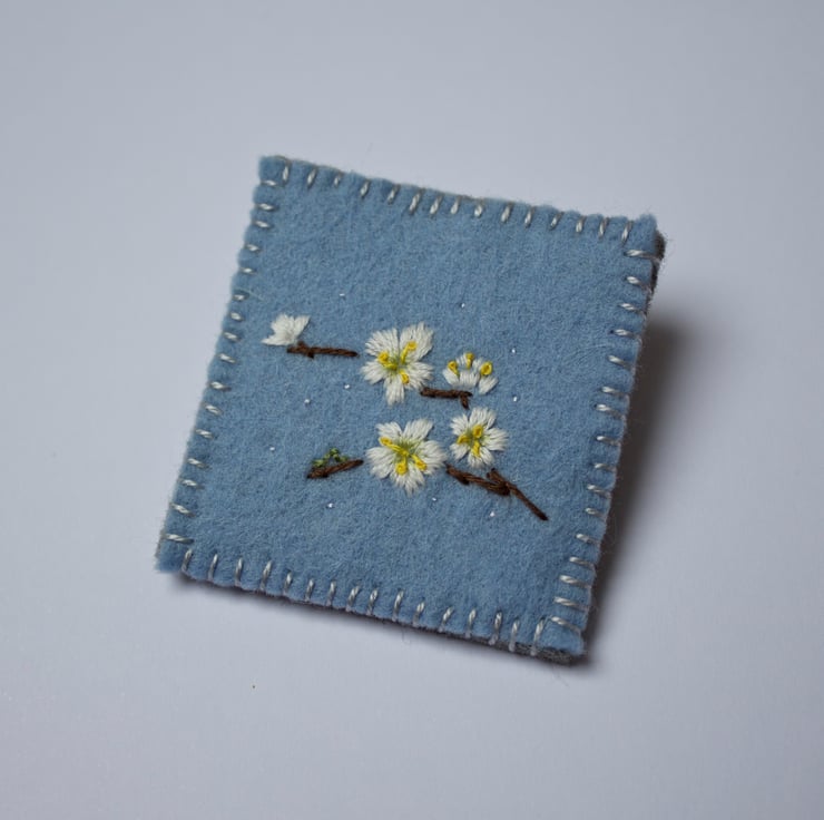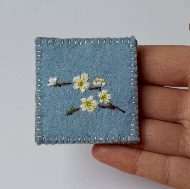 This art brooch has been embroidered onto a pale blue wool felt which creates the perfect setting of a blue spring sky for these blossoms. The embroidery has then been backed onto a piece of thick wool felt in my signature style which adds stability and sturdiness to the finished brooch.