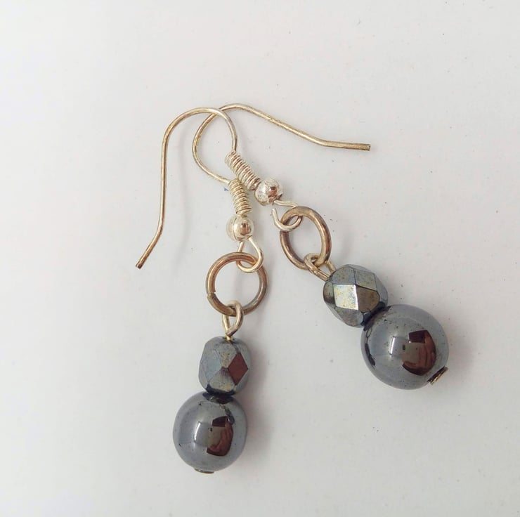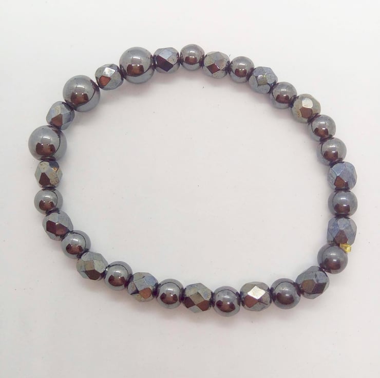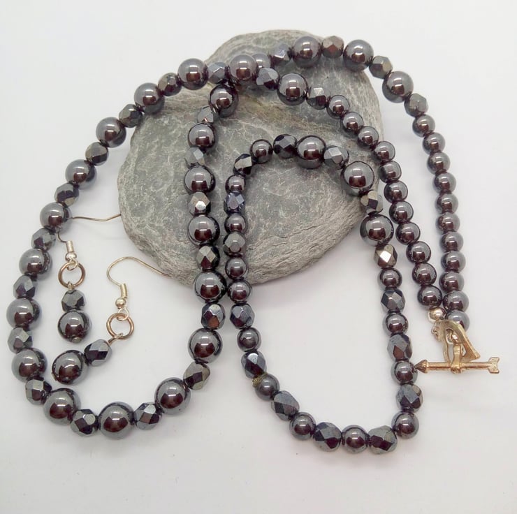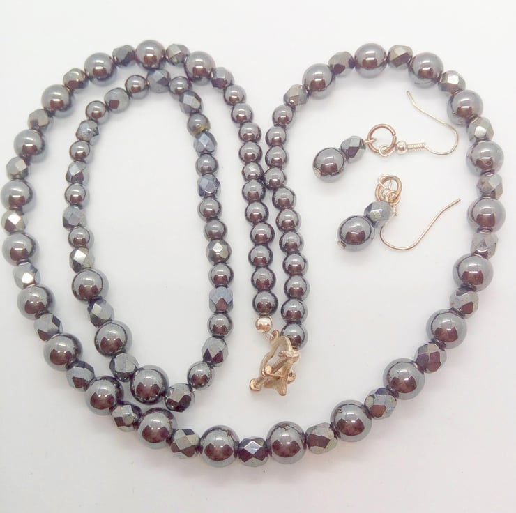 This stunning jewellery set is made using 8 mm round charcoal grey haematite beads and 6 mm round and faceted haematite beads. The earrings have silver plated ear wires and the necklace has a silver plated heart toggle clasp. The bracelet is elasticated to stretch to fit most wrist sizes.