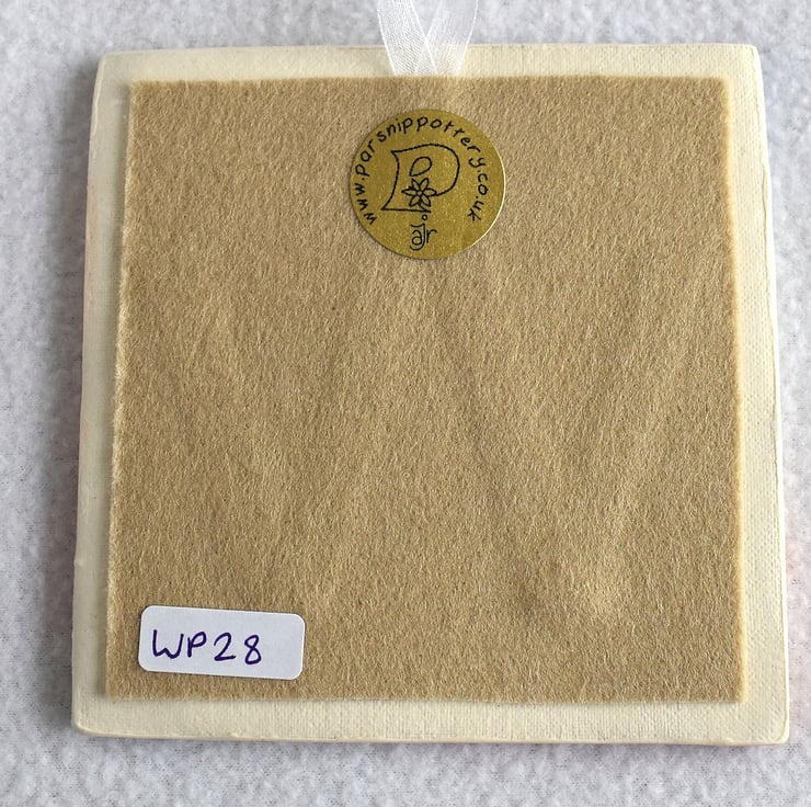The decorative style for this tile was inspired by Annette's drawings for adult colouring books. The picture was drawn by Annette and from this drawing an adhesive stencil was made. Three coats of glaze were painted carefully into the outlines to colour the image. Once the glaze was dry the stencil was removed to leave an un-glazed outline, which when kiln-fired leaves the image outlined in the off-white colour of the vitrified clay.