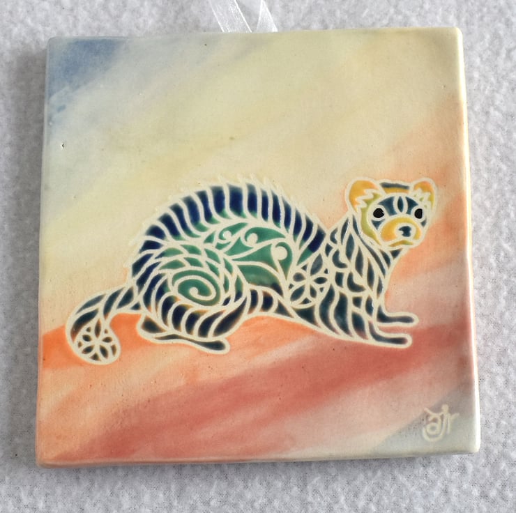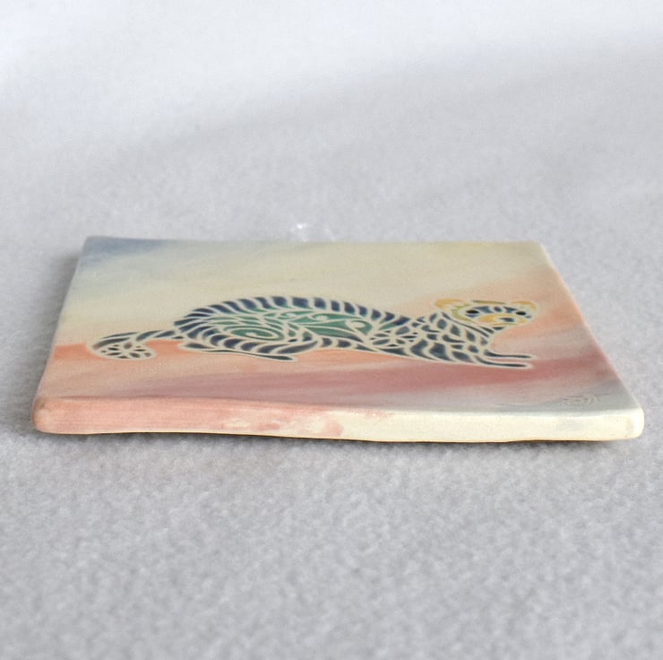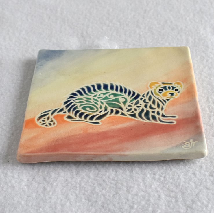 A hand cut square tile measuring 11.2cm / 4&3/8" with a stencilled ferret design in satin matte glaze.