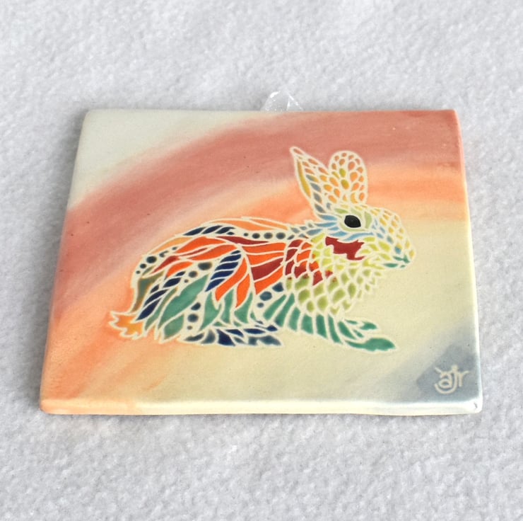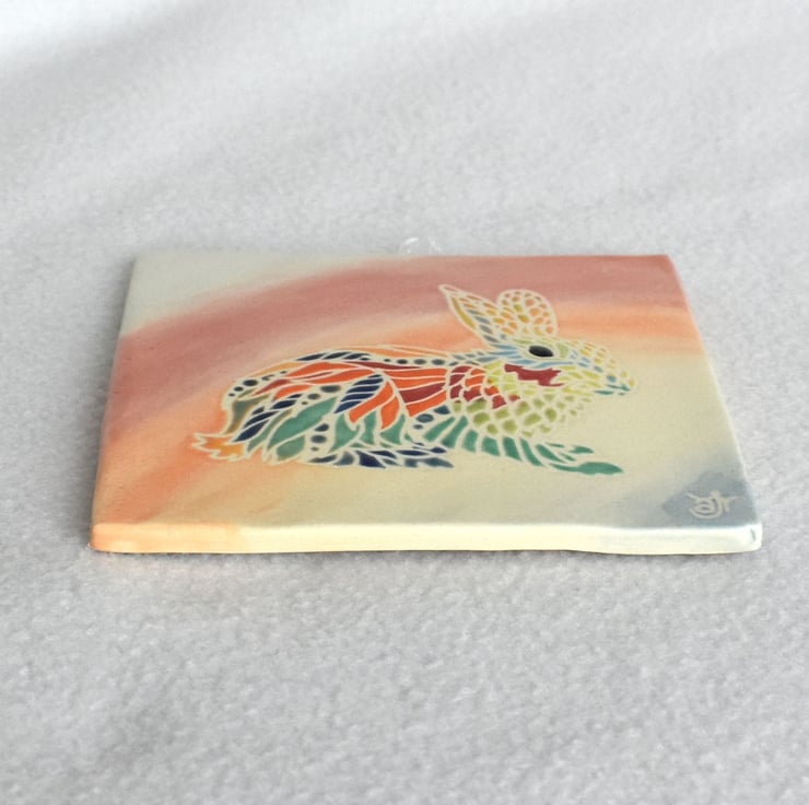 A hand cut square tile measuring 11.2cm / 4&3/8" with a stencilled rabbit design in satin matte glaze.