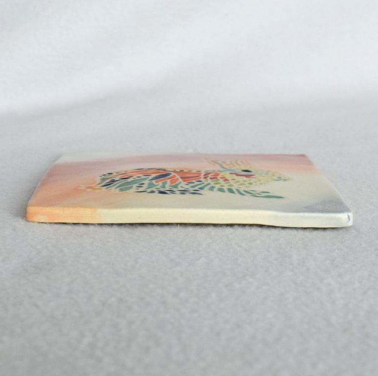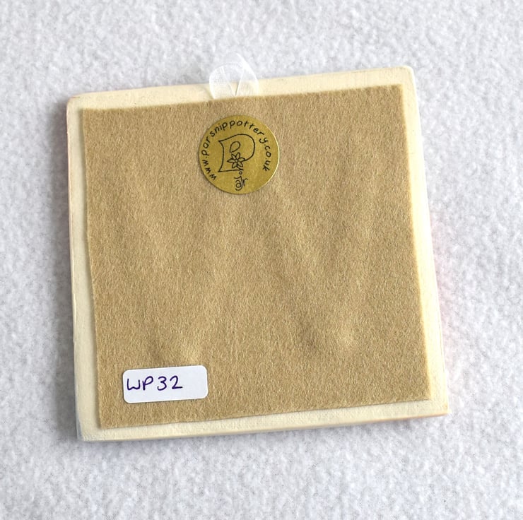 The decorative style for this tile was inspired by Annette's drawings for adult colouring books. The picture was drawn by Annette and from this drawing an adhesive stencil was made. Three coats of glaze were painted carefully into the outlines to colour the image. Once the glaze was dry the stencil was removed to leave an un-glazed outline, which when kiln-fired leaves the image outlined in the off-white colour of the vitrified clay.