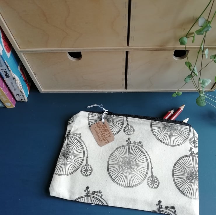 This pencil case has been hand made and hand printed using my hand carved Penny Farthing linocut stamp.
