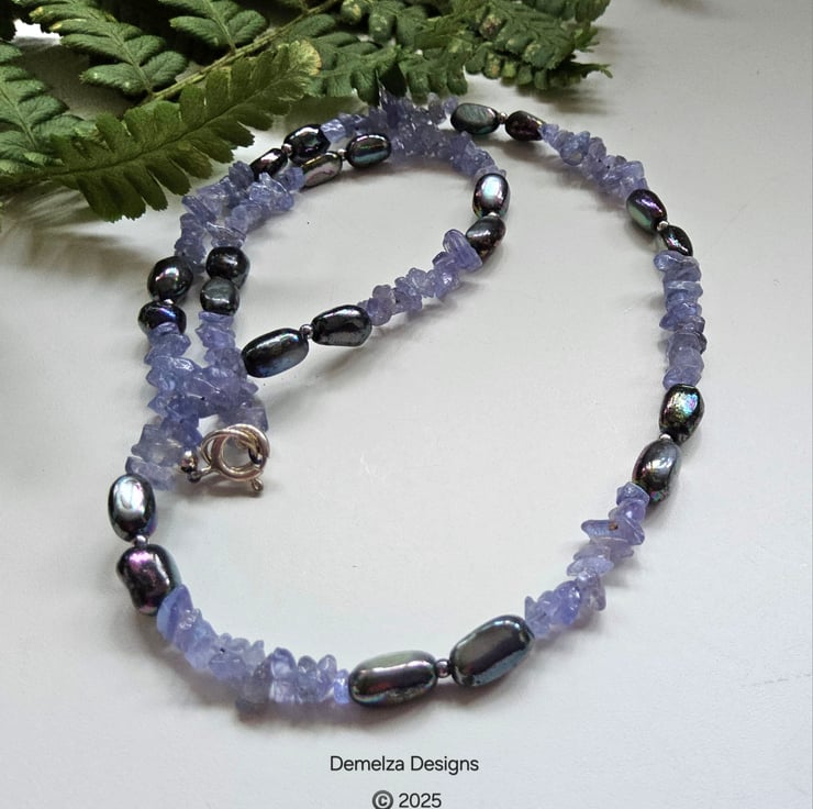 This pretty delicate looking necklace has been designed and hand crafted in Cornwall using A grade tanzanite nuggets with dark blue/silver borogue culture pearls. Between the pearls are 2mm sterling silver spacer beads adding a touch of sparkle.