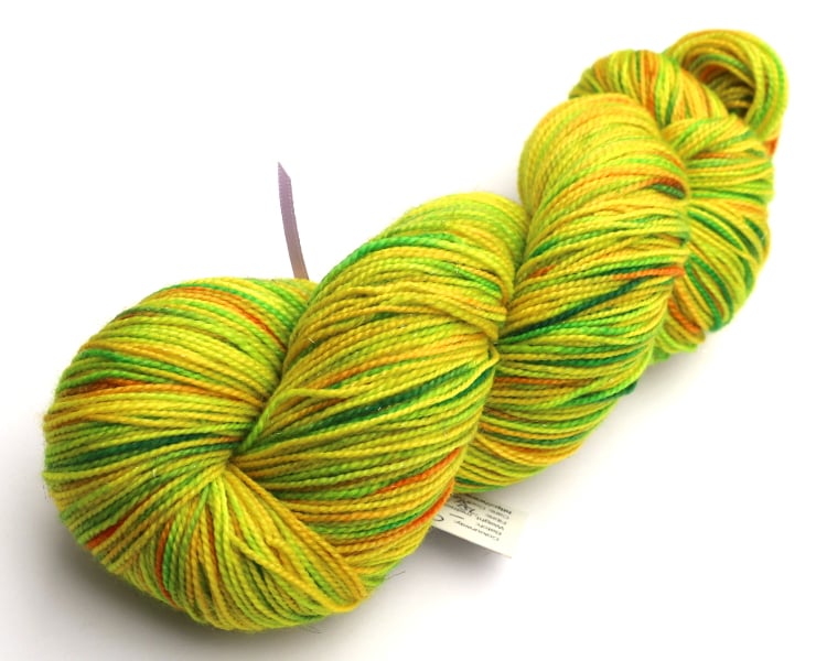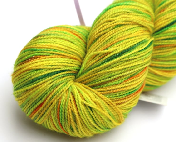 Lemon yellow with orange and lime greens and silver stellina sparkle. This is a soft, lustrous 4-ply weight yarn with added stellina sparkles, that are almost impossible to capture accurately in photographs (they show as whitish flecks). In real life they catch the light and add a little sparkle. Photographs have been taken and edited in bright natural light.