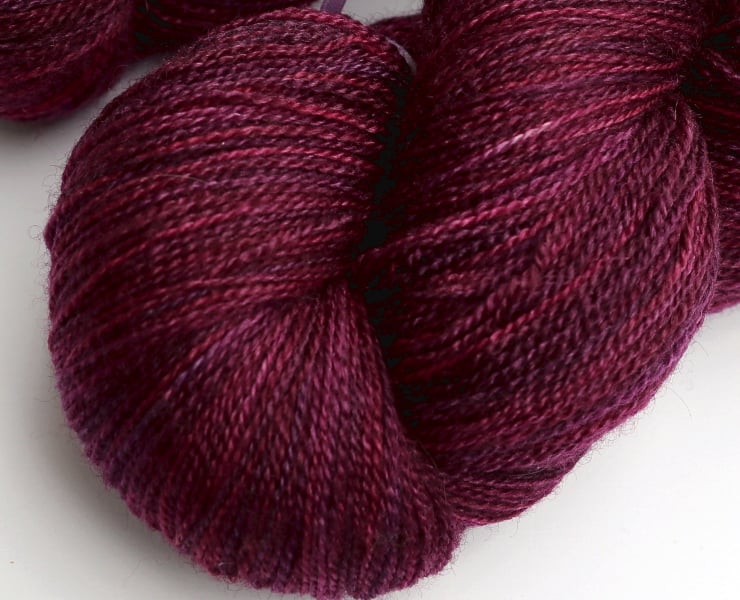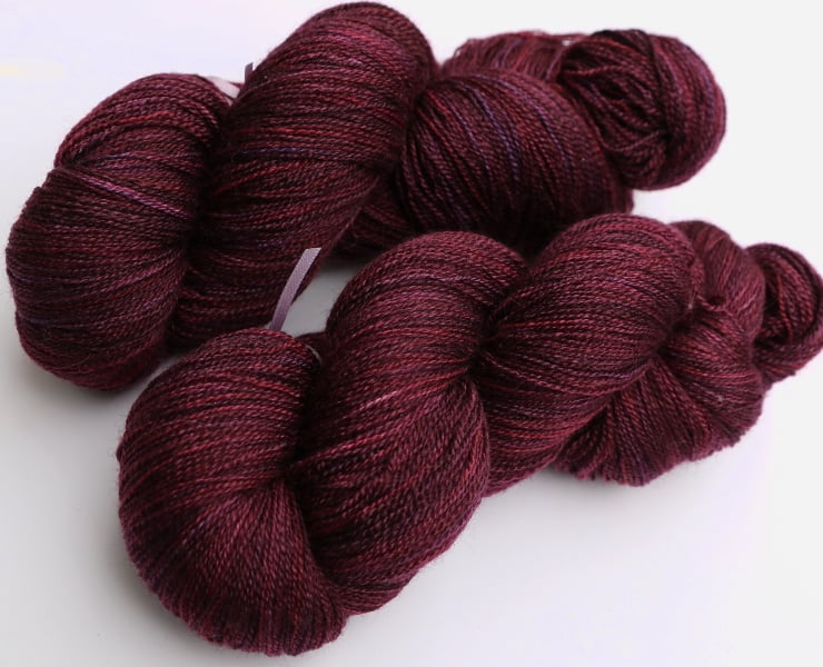 Deep semi-solid wine reds with purple hints. This lustrous, lofty, silky-soft yarn should make beautiful lace projects. There are two skeins available (price shown is for one). Photographs have been taken and edited in bright natural light.