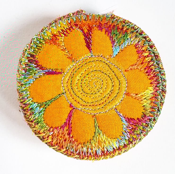 Made from layers of fabric including hand dyed Egyptian cotton and silk fabrics using the free machine embroidery style of sewing