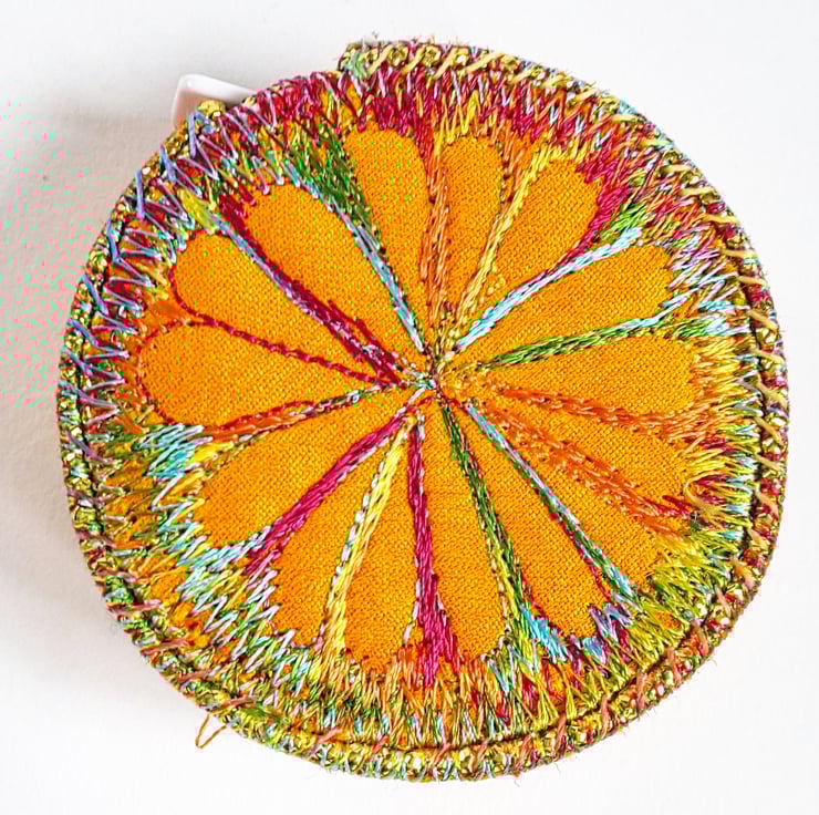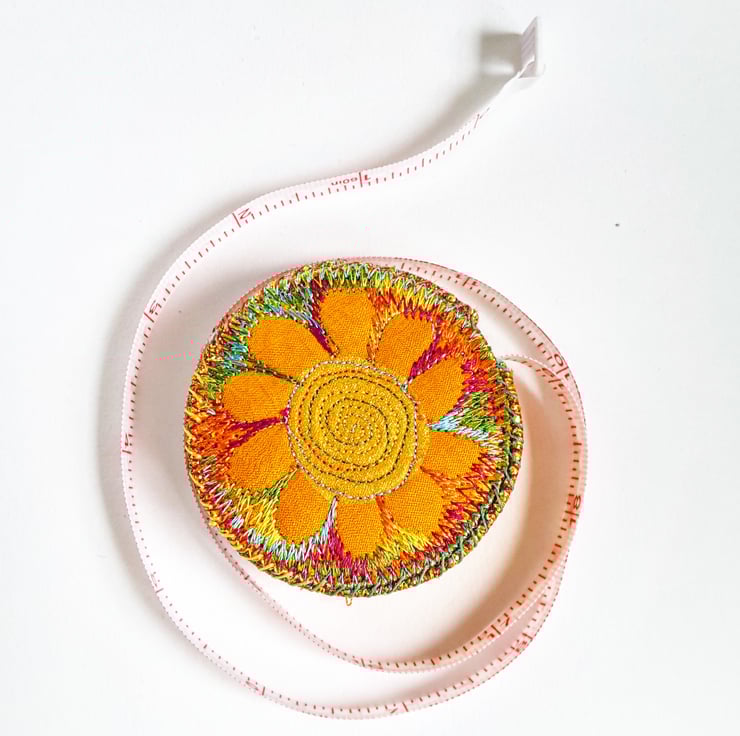 This is a handmade machine stitched fabric sewing tape measure