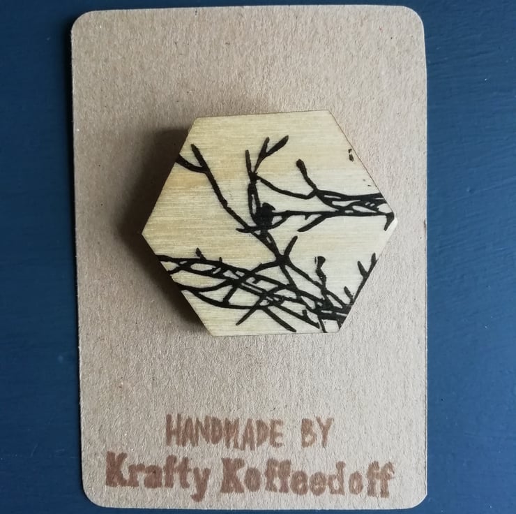 The brooch has been stamped with one of my hand carved stamps depicting a bird satin tree branches. It has been coated with varnish.