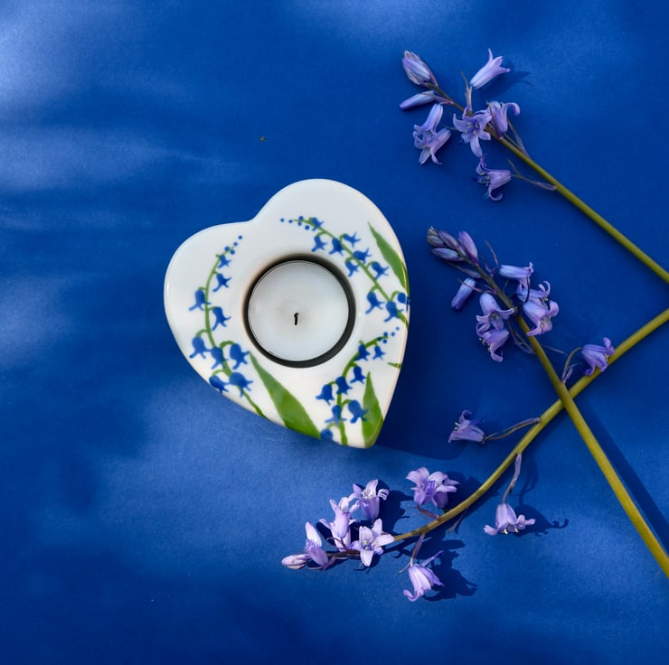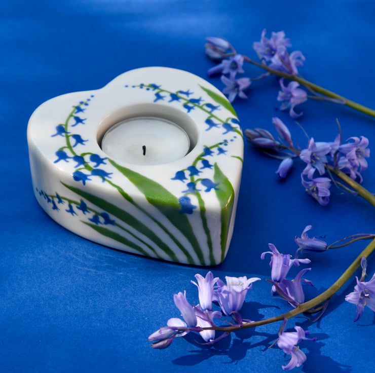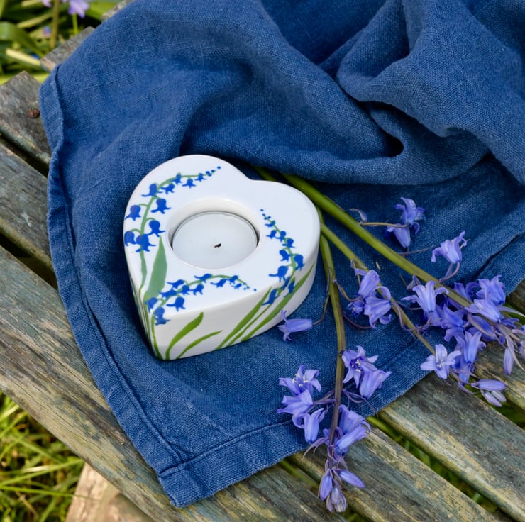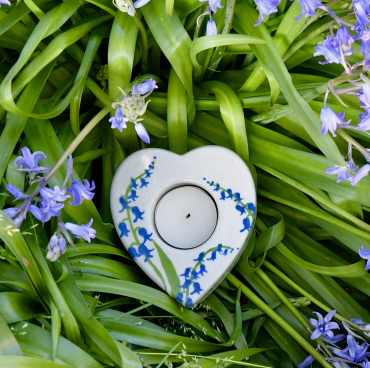 This Bluebell heart-shaped tea-light candle holder has hand painted bluebells on it, so it is a perfect gift to give or to keep for you!
