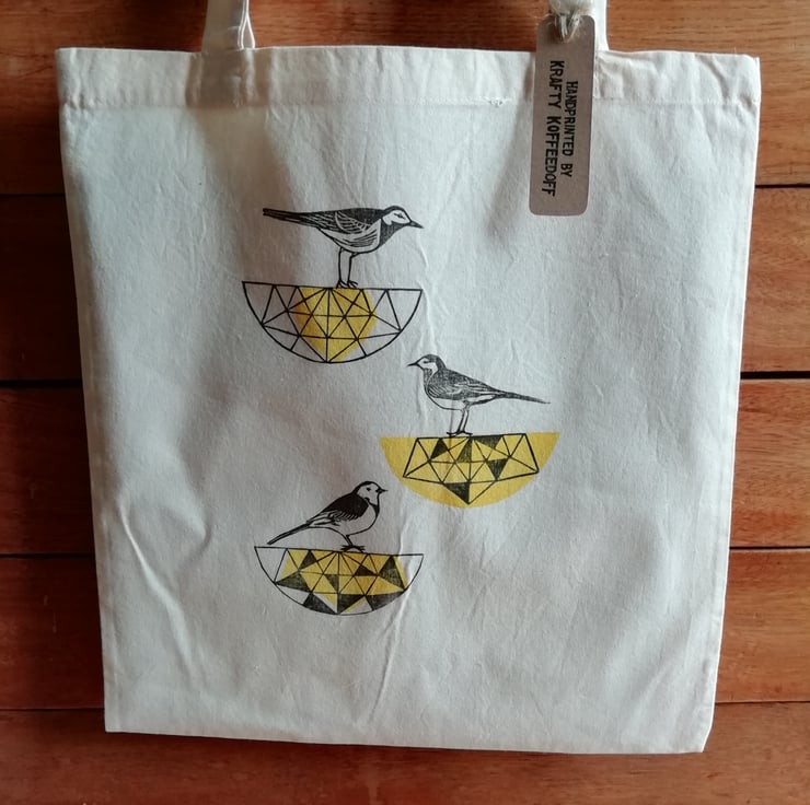 Block Handprinted Tote Bag printed using my hand carved Pied Wagtail and Geometric linocut stamp.