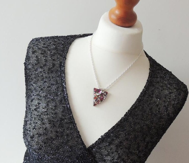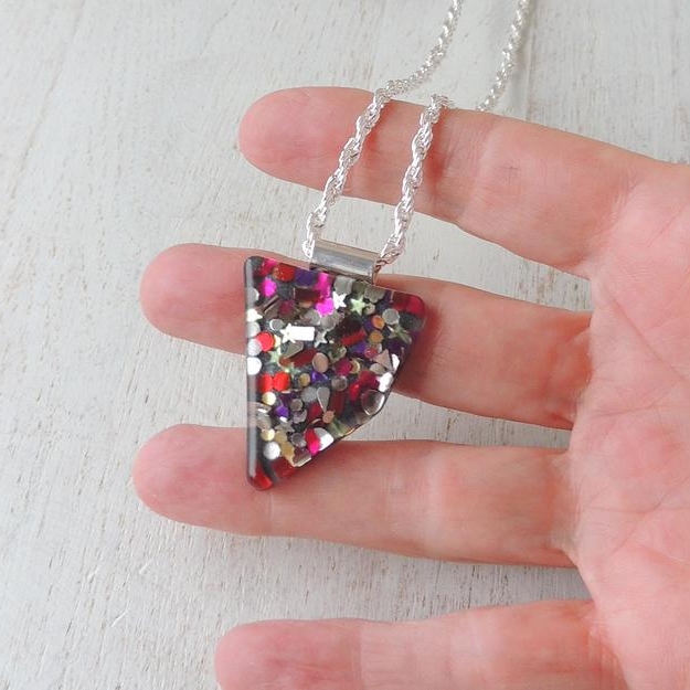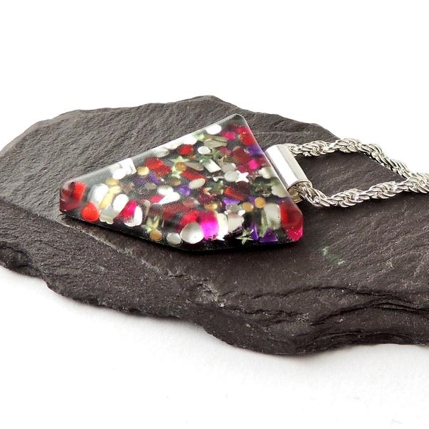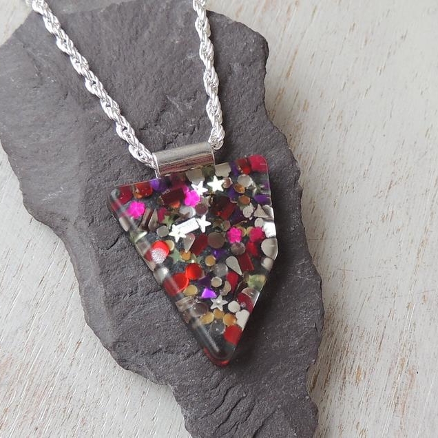 I made it by casting lots of multicoloured little sparkly spangles in a resin pendant, finishing with a black colour background. The tube bail is embedded in the resin on the reverse side for additional security.