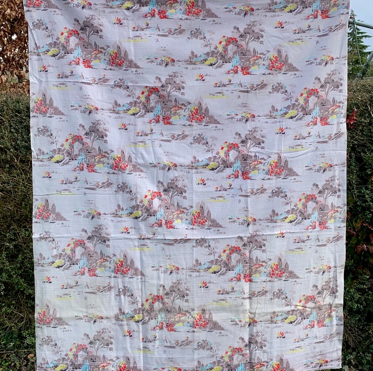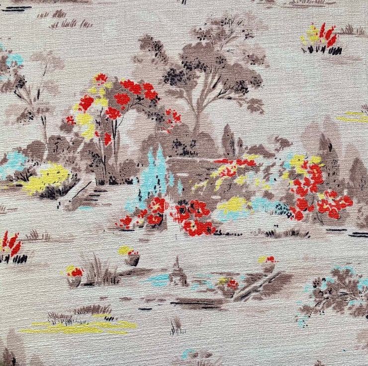 MCM 50s Pictorial Garden Landscape Shades of grey Barkcloth Vintage Fabric - a subtle feature in a modern or vintage style