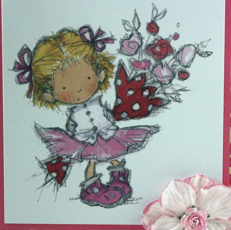 The image has been framed with pink card and overlaid onto a pink and cream patterned background. The card has been embellished with pink paper flowers.