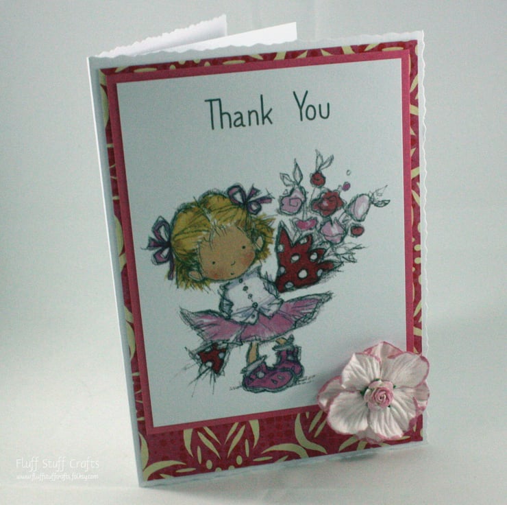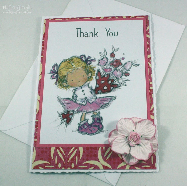 A6, deckle edged thank you card featuring an image of a young girl holding a bouquet of flowers, with the sentiment 'Thank You' printed above. Perfect for saying thank you to a teacher at the end of the school year.