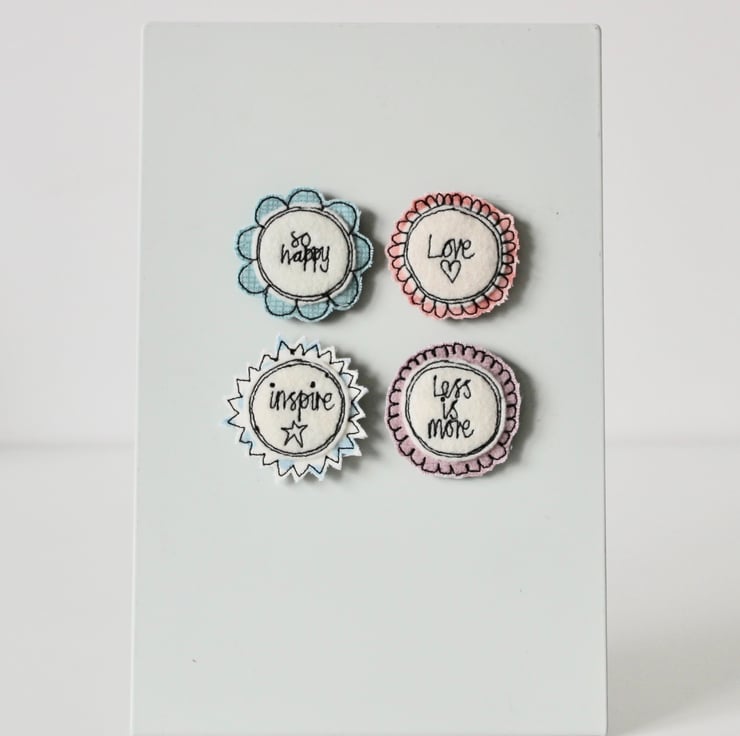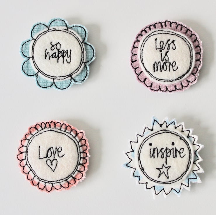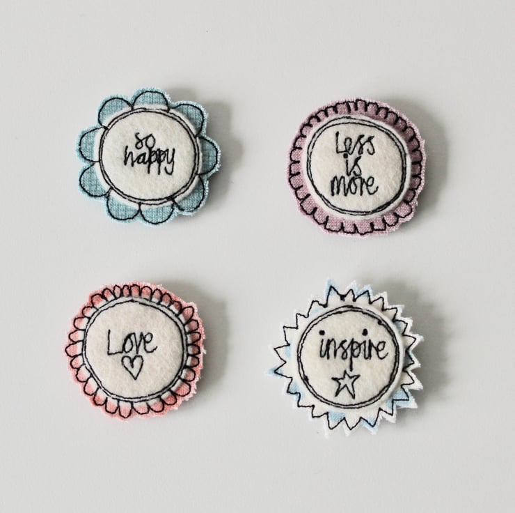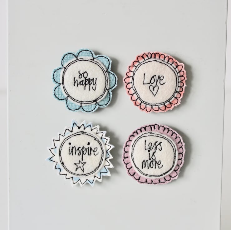 Each magnet is created using multiple layers of cloth, sewn using freehand machine embroidery and then cut out by hand. The magnet on the back is attached with hot glue.