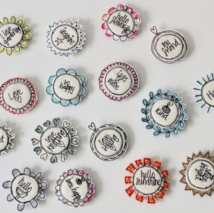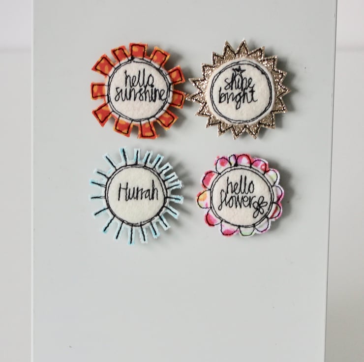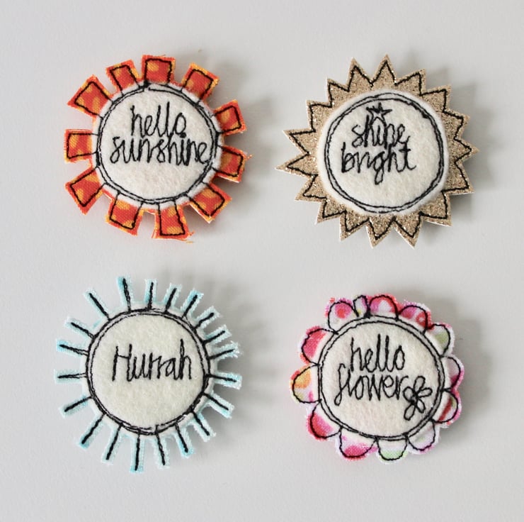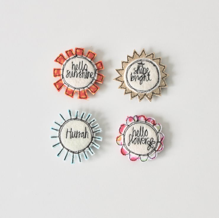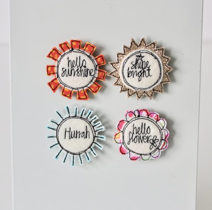 Each magnet is created using multiple layers of cloth, sewn using freehand machine embroidery and then cut out by hand. The magnet on the back is attached with hot glue.