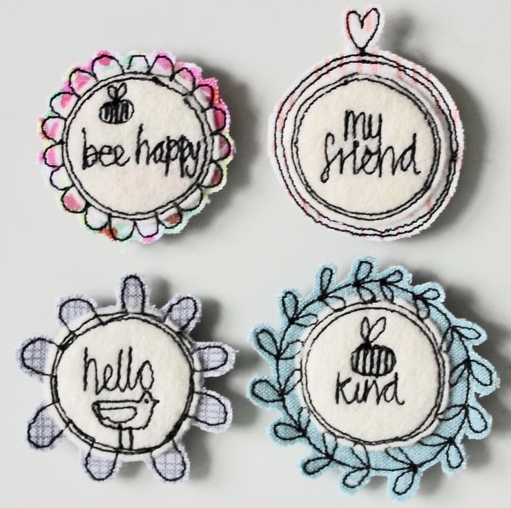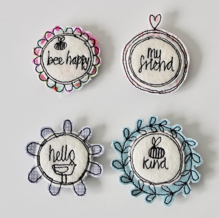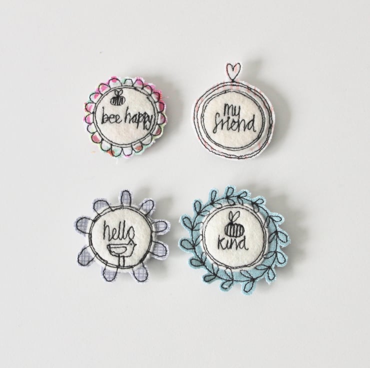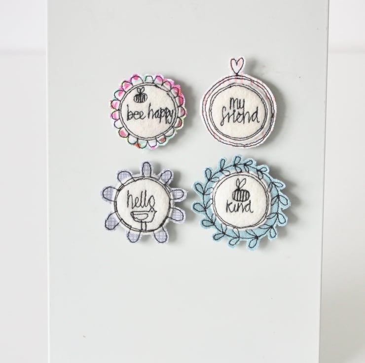 Each magnet is created using multiple layers of cloth, sewn using freehand machine embroidery and then cut out by hand. The magnet on the back is attached with hot glue.