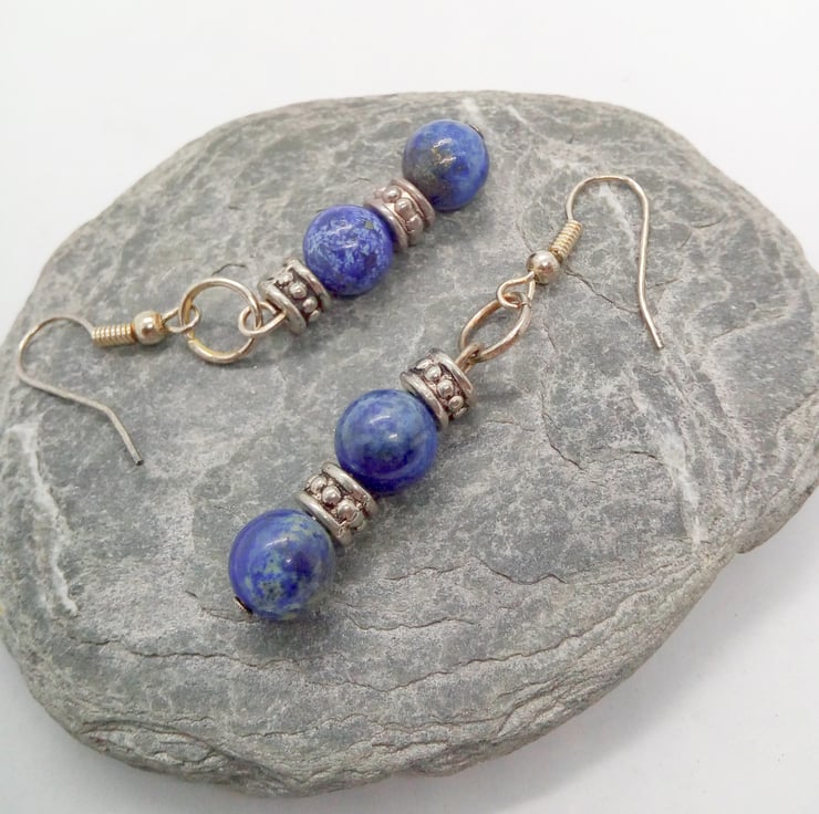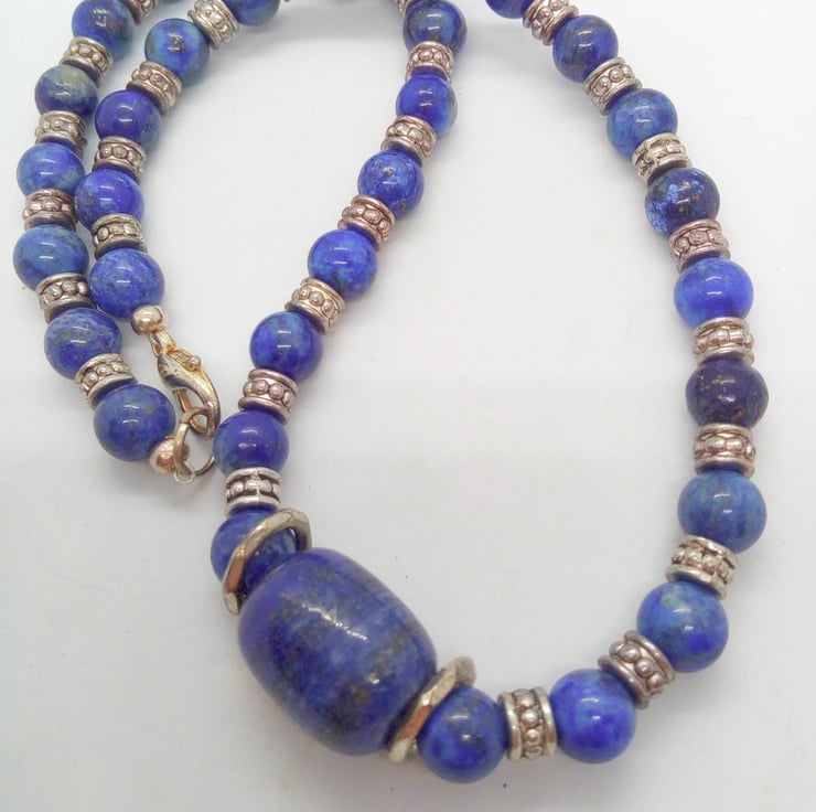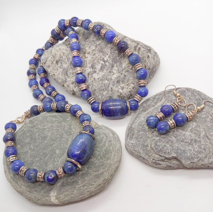 The Jewellery Set is made using beautiful Lapis Lazuli beads with silver plated spacer beads. The necklace and the bracelet have silver plated lobster clasps and the earrings have silver plated fish hook ear wires.