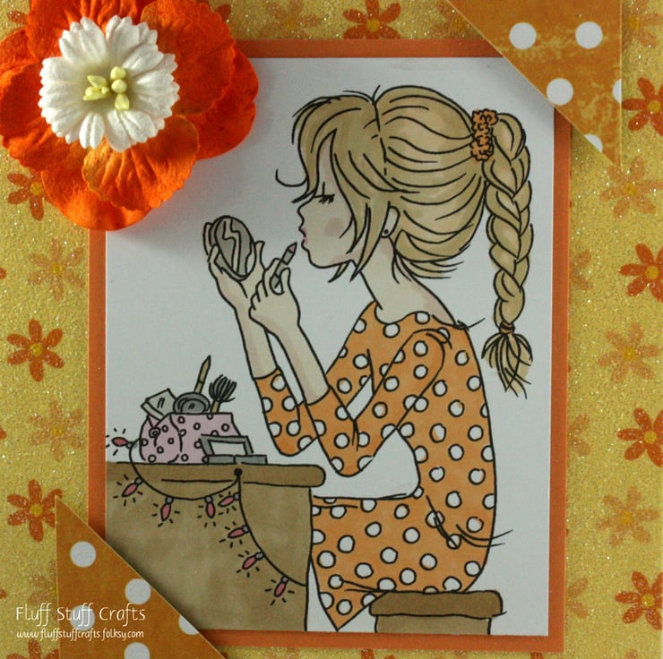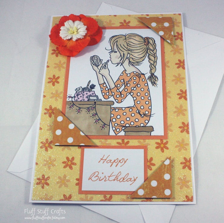 Handmade birthday card suitable for ladies or teenage girls, featuring a hand coloured image of a girl putting her make up on.