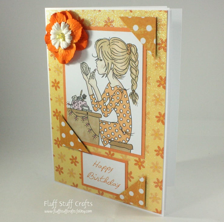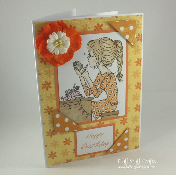 The image has been framed in orange card and overlaid onto a glittered, yellow and orange floral background. Coordinating polka dot card has been used to create corners over the image and the sentiment 'Happy Birthday'.