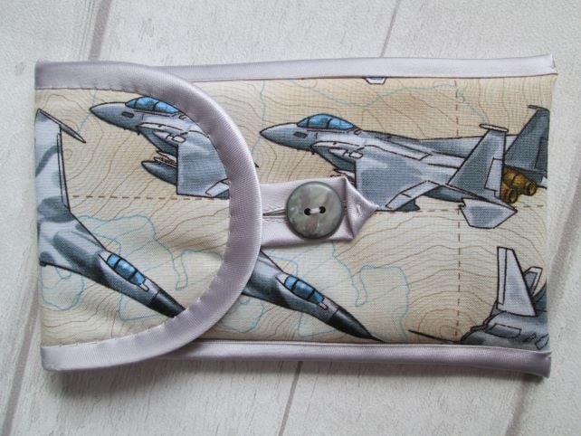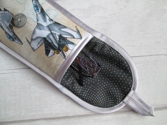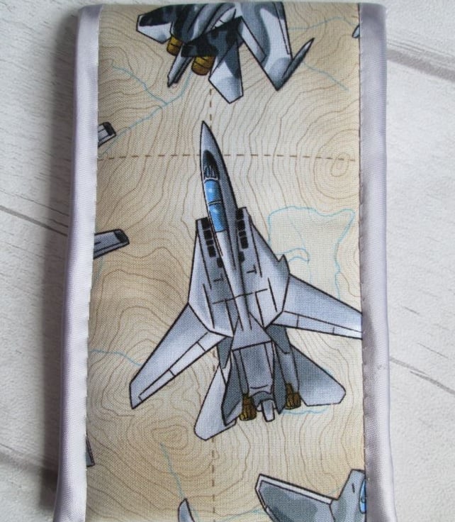 The ideal glasses or phone case for an airshow or military aviation enthusiast - this cotton print has an assortment of military planes on a map style background. It is lined with a coordinating cotton print and lightly wadded to protect the contents. Finished with grey bias binding and a toning button, it will take most pairs of glasses and phones up to 16 cm x 7.5 cm x 1 cm.