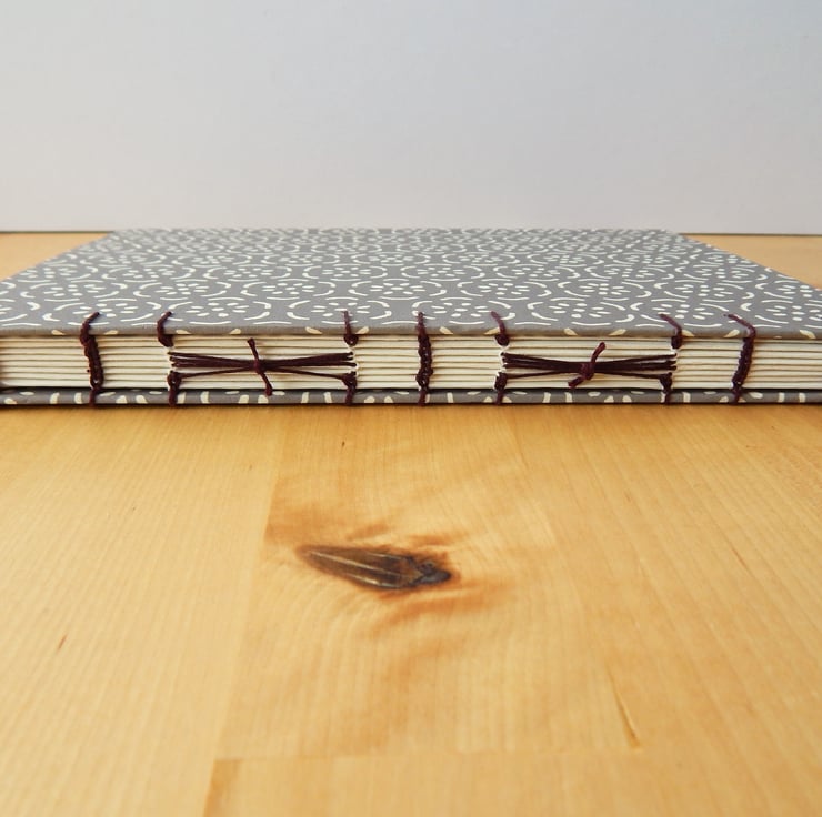 Binding is hand sewn, with a combination of coptic style chain stitch & tied sections of longstitch, in deep burgundy linen thread. The binding allows the book to open out flat throughout.