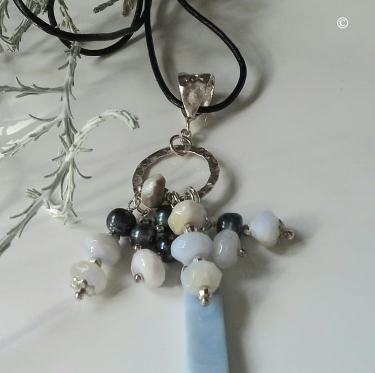 A unique charm pendant designed and hand crafted using irregular shaped faceted blue opal rondelles and one elongated rectangle blue opal complimented with deep blue freshwater culture pearls. They have all been wire wrapped using sterling silver wire on to a hammered sterling silver round disc with a hammered sterling silver bale and hand polished. The faceted sterling silver beads and bead caps add a touch of sparkle. The pendant has been attached to an extra long genuine leather cord which can be cut too the desired length and tied at the back or worn with a sterling silver chain ( not supplied with the pendant). It will make a perfect unique gift for a special friend or for a loved one to wear on a daily bases.