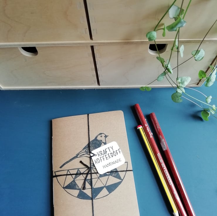 This is an A6 size notebook made with recycled kraft card containing 16 leaves of acid free cartridge paper.
