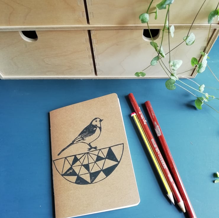 A handmade notebook that has been hand printed using my Pied Wagtail and Geometric linocut.